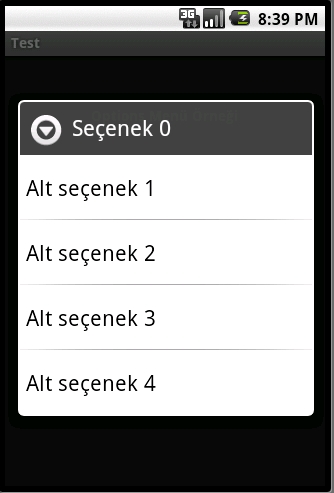 Uygulamayı bu haliyle çalıştırıp cihazın/emülatörün “menü” tuşuna bastıktan sonra aşağıdakine benzer bir görüntü elde etmemiz gerekir.