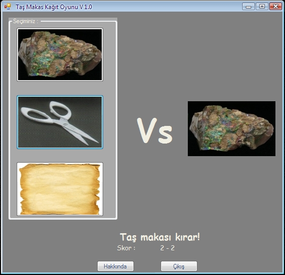 Gerçek hayattaki oyunda elinizle hangi şekli yapmak istiyorsanız, programda da o resmin üzerine tıklayacaksınız. Program da kalan iki seçenek arasında rastgele bir seçim yapacak. Yukarıdaki kurallara göre eğer siz kazanırsanız skor tabelasında sizin hanenize bir sayı, kaybederseniz programın hanesine bir sayı eklenecek.